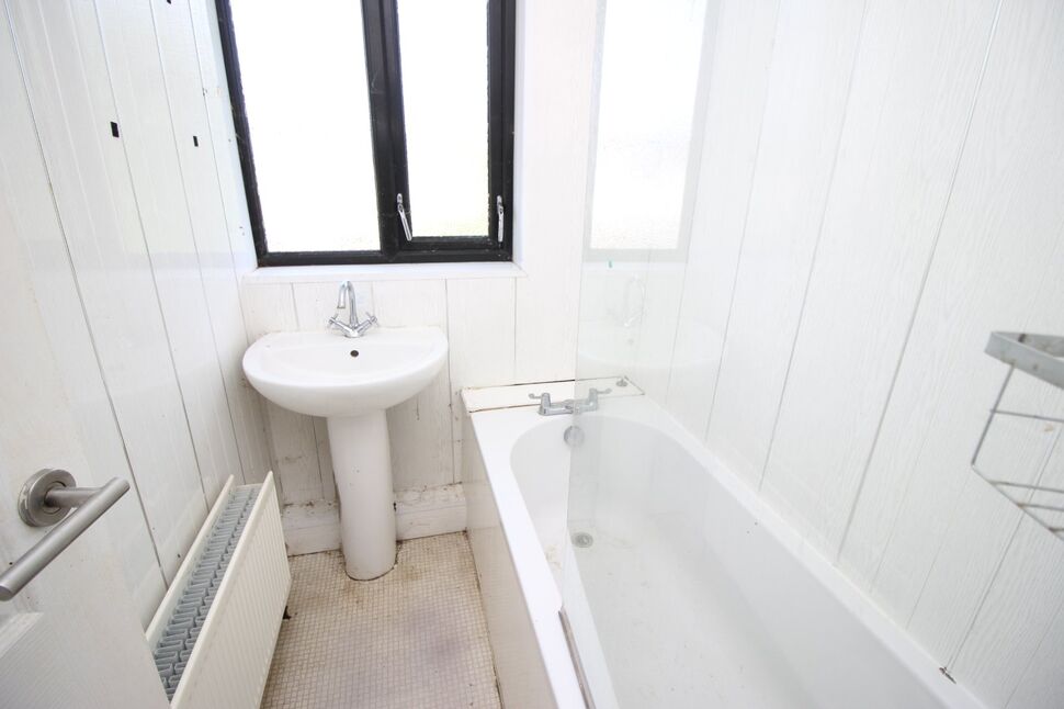Paneled bath, Linoleum flooring, White suite, Wall-mounted basin with separate pillar taps.