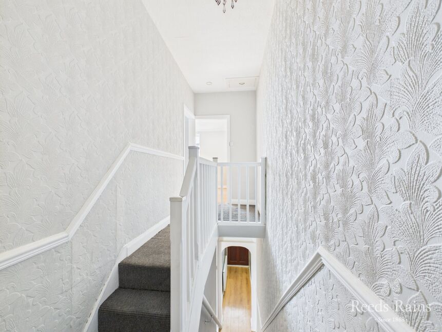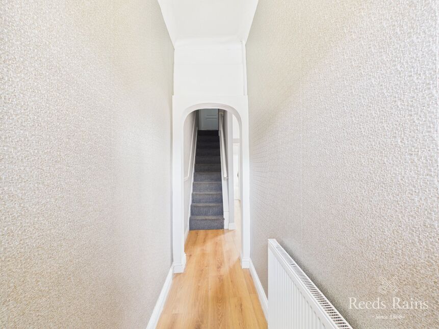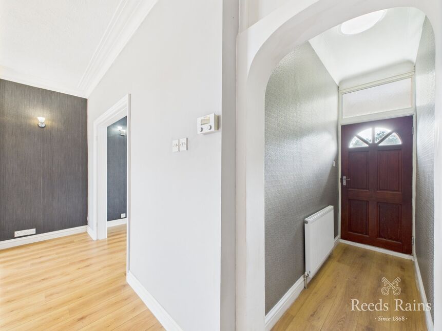 Approached from the front via a part-glazed timber entrance door, this delightful entrance hall sets the tone for the rest of the home. Smart laminate flooring flows seamlessly through the main reception areas, while soft tones and classic features create a warm and welcoming first impression. A radiator adds comfort beneath the staircase, which rises to the first floor, and open-plan access continues directly through to the dining room.