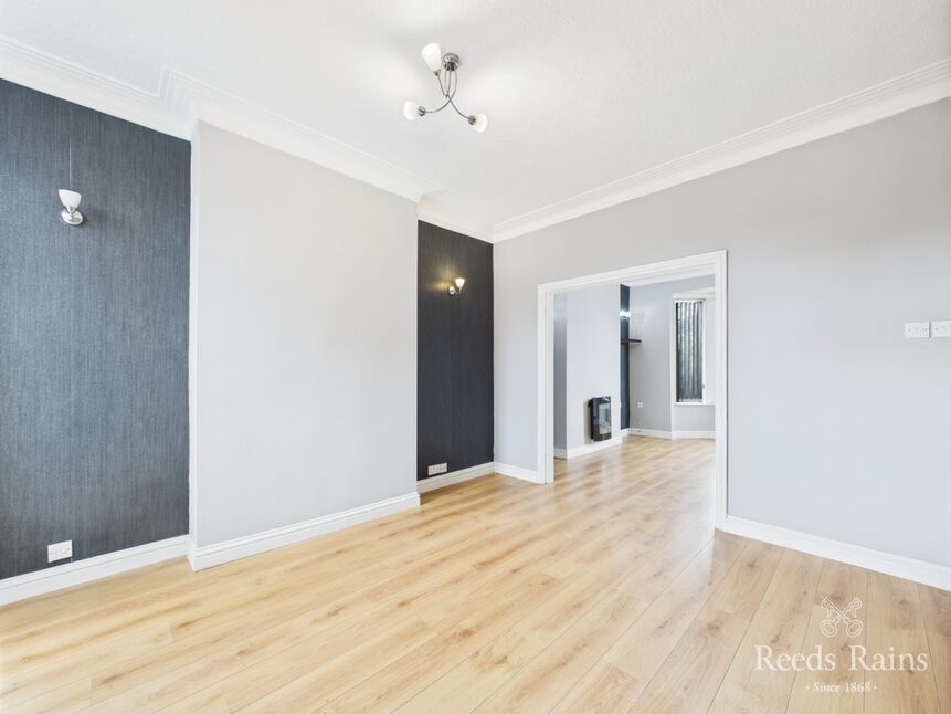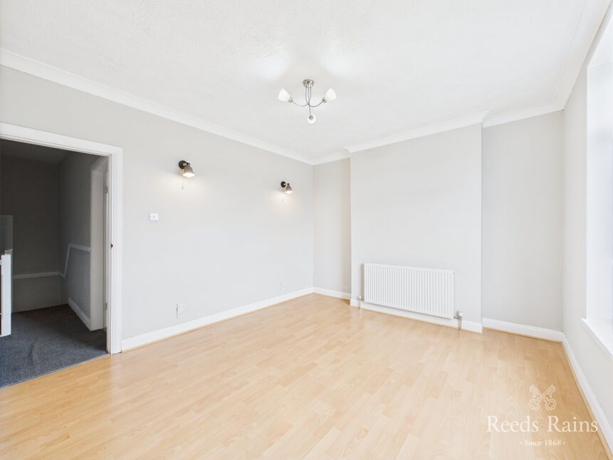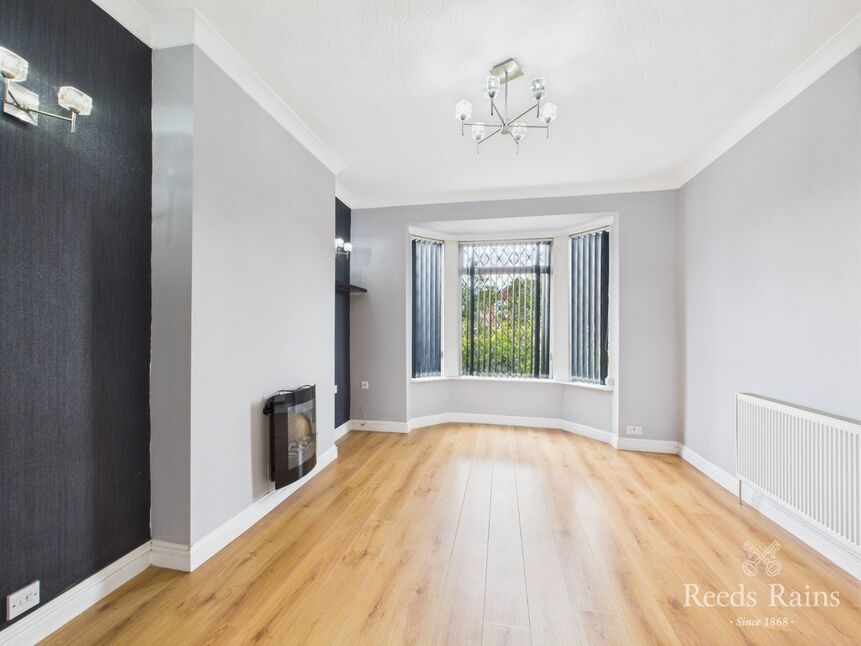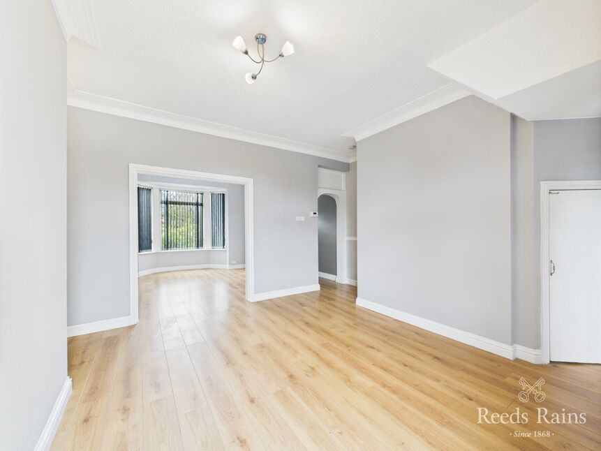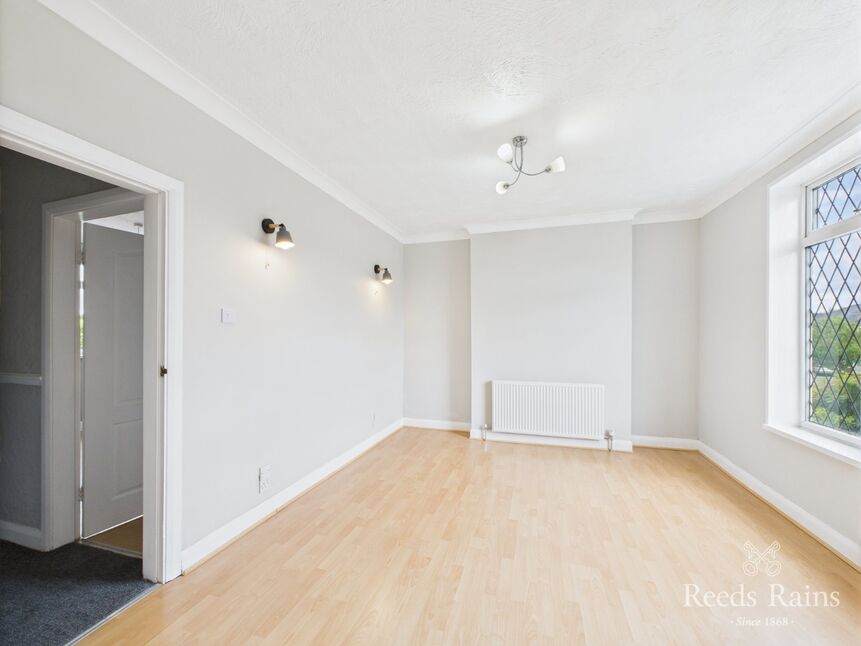 Set at the front of the property, this well proportioned sitting room is bathed in natural light from a deep walk-in bay window, which offers garden views and frames the room perfectly. The space has been thoughtfully opened through to the dining room and hallway, creating a fluid, sociable layout ideal for modern living. A stylish wall-mounted electric fire acts as the focal point, complemented by ceiling coving, wall light points, and radiator.