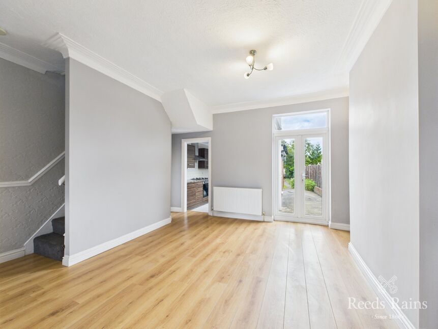 Positioned at the rear of the home, the dining room is a bright and versatile space with French doors that open out to the garden, providing an easy flow for indoor-outdoor entertaining. A built-in under-stairs cupboard offers useful storage, and the flooring continues through for a consistent finish. Traditional ceiling coving, wall lights, and a radiator complete the setting, creating the ideal space for relaxed dining or lively family meals.