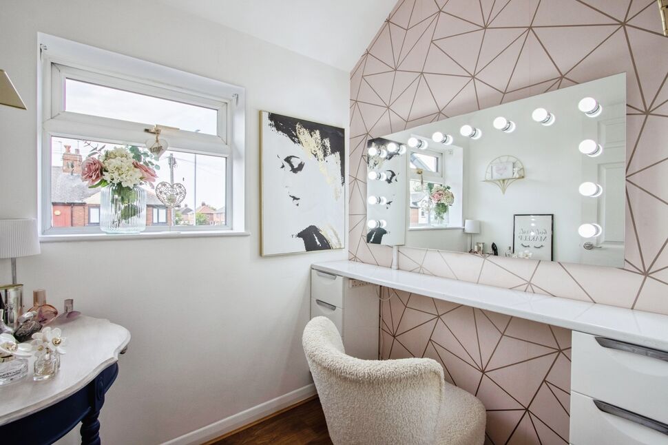 This property was built as a three bedroom end terrace. The current owners have renovated the house throughout including swapping around the original bathroom and the original second bedroom. As a result the current bathroom is huge and a very impressive space and the third bedroom is quite small and used as a dressing room.