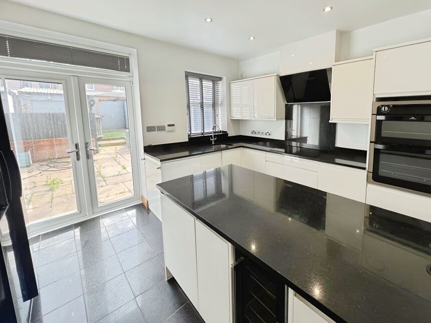 Modern monochrome kitchen fitted with a range of wall and base units, cupboards and drawers, inset sink unit with mixer tap over, breakfast bar/island, built in eye level double oven, electric hob with feature extractor hood over, gas and electric cooker points, plumbed for washing machine, partially tiled walls, tiled flooring, radiator, UPVC double glazed window and french doors leading into the rear garden.