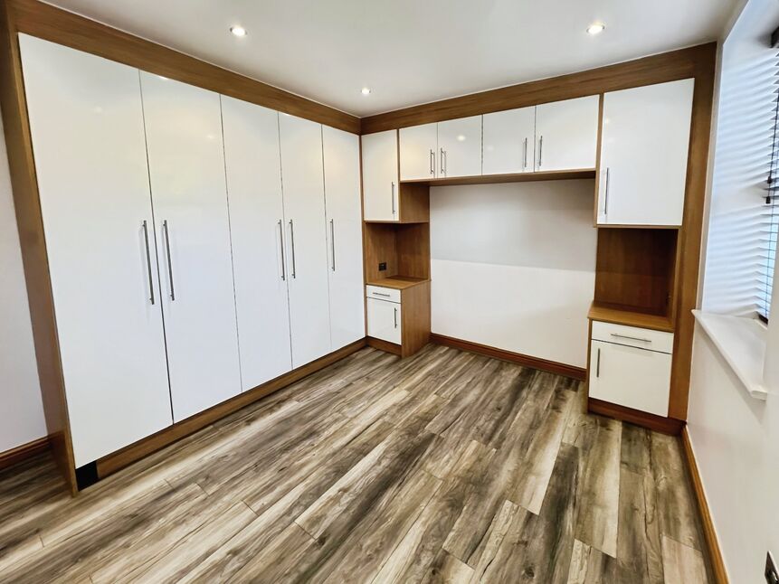 UPVC double glazed window, modern fitted wardrobes and over bed head cupboards, radiator.