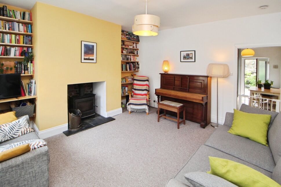 Feature fireplace with multi fuel stove, TV point, cupboard housing the electric meter, shelving in to the chimney recess and opening to the dining kitchen.