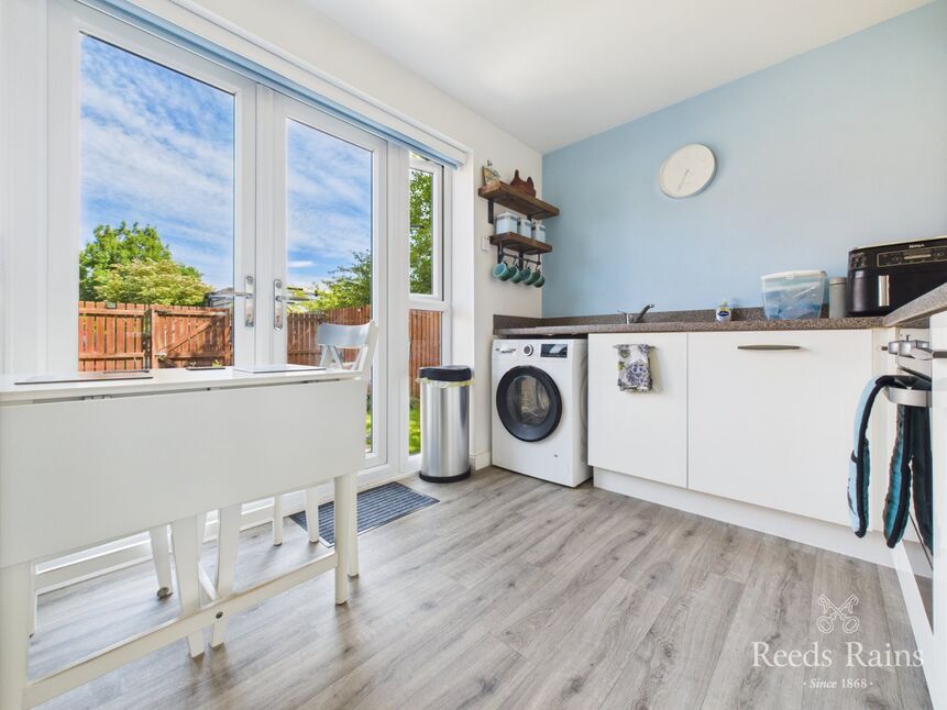 Laminate units and worktops house integrated kitchen appliances and allows space for storage of kitchen items. With a window and patio doors to the rear.