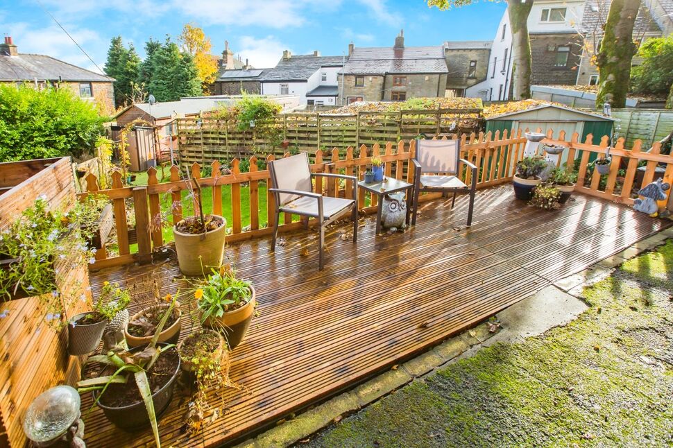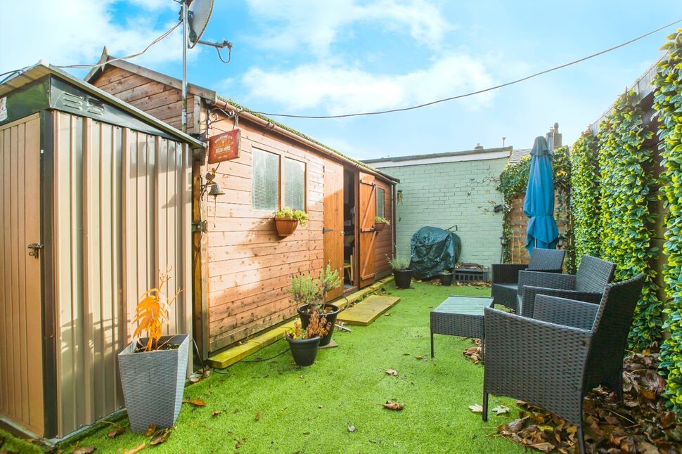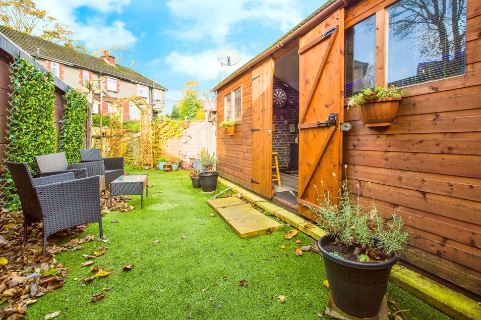 To the front of the property is a drive providing off-road parking, to the side is a seating area and path leading to the rear where there is a generous sized garden which provides a decked seating area and an enclosed lawned garden. To the foot of the garden is a garden room and a garden shed.