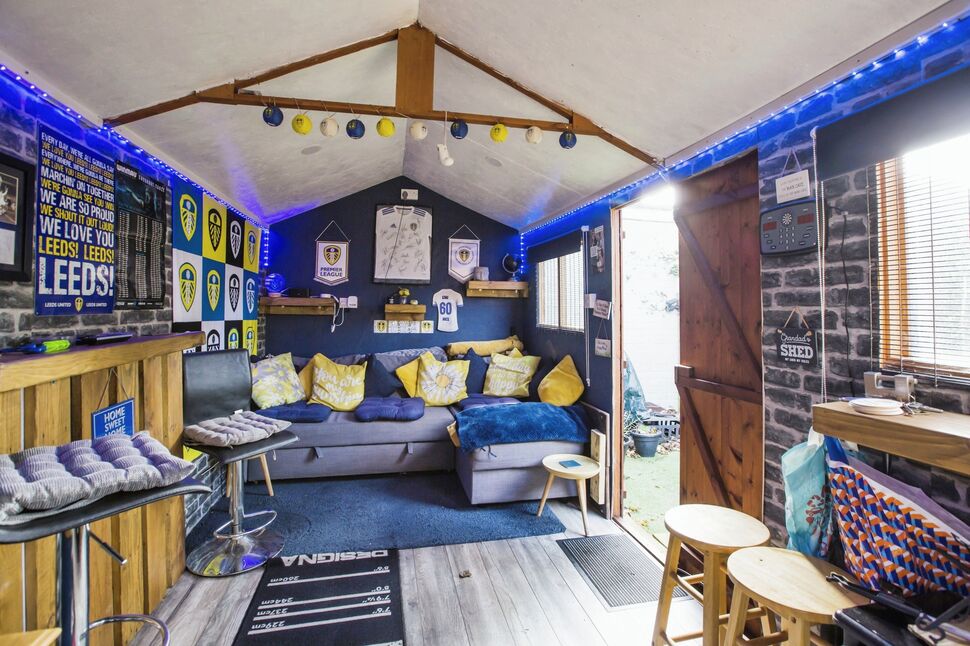 A timber built garden room which has a seating area and a games area. There is also power, lighting and satellite TV connection.