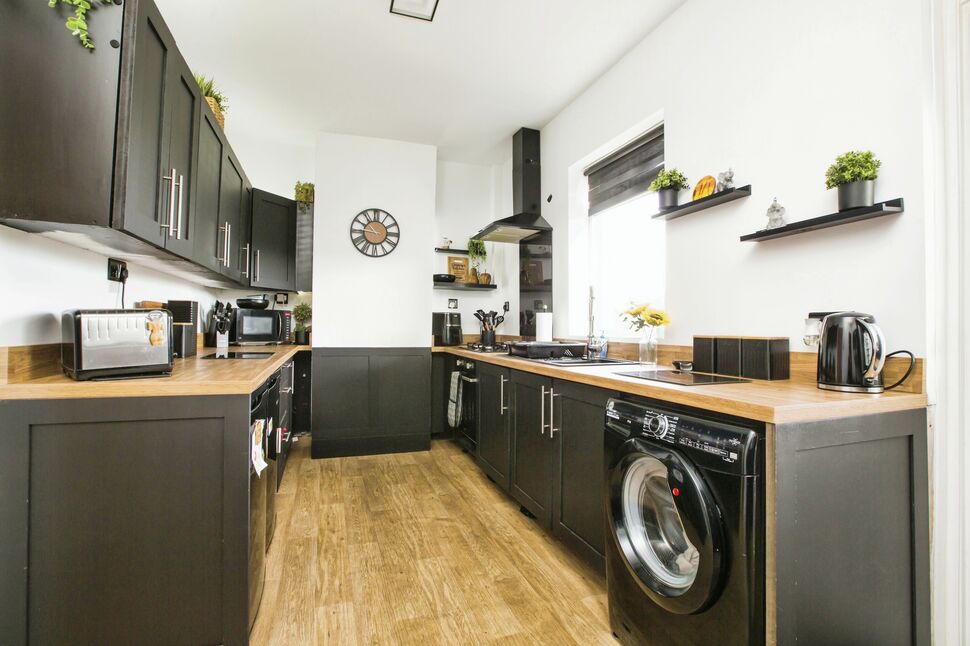 A modern fitted kitchen providing wall and base units and complementary work surfaces with an inset sink and drainer unit. Integrated electric oven with a gas hob over and an extractor hood. Plumbing and space for a washing machine and under counter space for a fridge and freezer. Window to the rear and a good sized dining area with an under stairs storage cupboard and a door opening to the rear garden.
