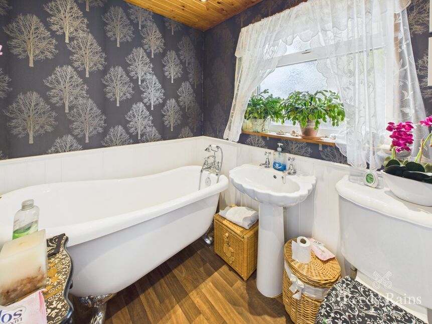 Comprised of a three piece suite which includes a bath with a shower attachment, pedestal with a wash hand basin and a low level. Wood effect flooring and a double glazed wib