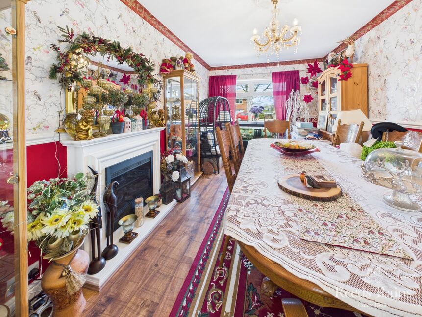 A generous sized kitchen offering a range of wall and base units work top surface areas and incorporating an inset sink unit. Space for a cooker, washing machine, dishwasher, tumble dryer and fridge / freezer. Tiled effect flooring and two radiators. Double glazed window and double glazed doors leading to the rear garden. Door leading to the dining room.