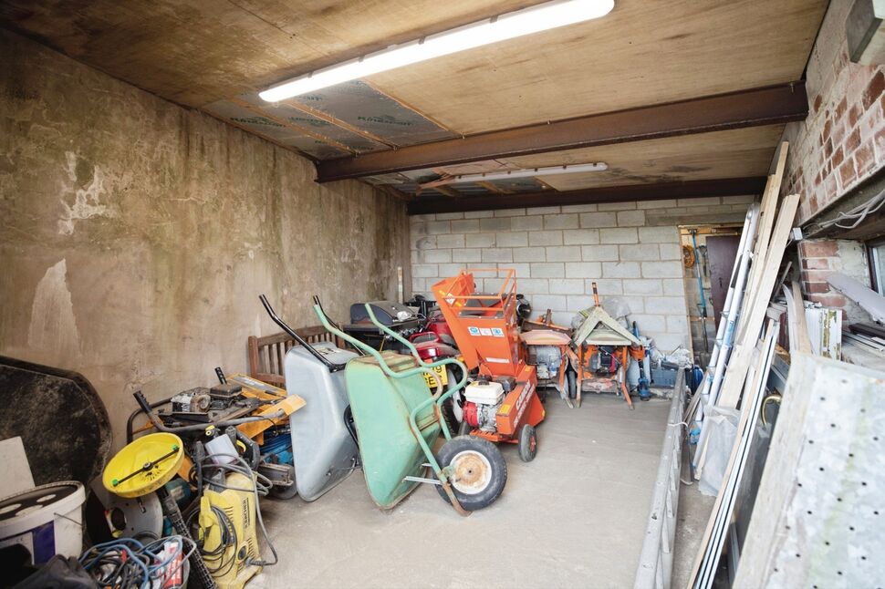 The garage sits to the side of the house with access in between the two. There is a side access door along with the front garage door. To the rear of the garage is a workshop space with toilet and water facilities. Potential for a granny annexe or further development.
