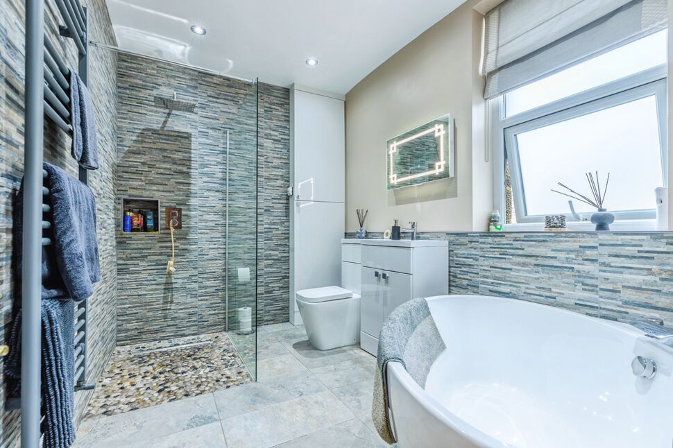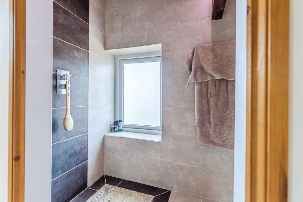 A fully tiled wet room with waterfall shower head and obscure glazed window to the side. Wc and heated towel rail.
