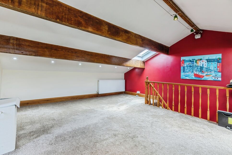 A huge attic bedroom with multiple velux windows, beamed ceiling and built in store cupboards along with further eaves storage. Ensuite to side.