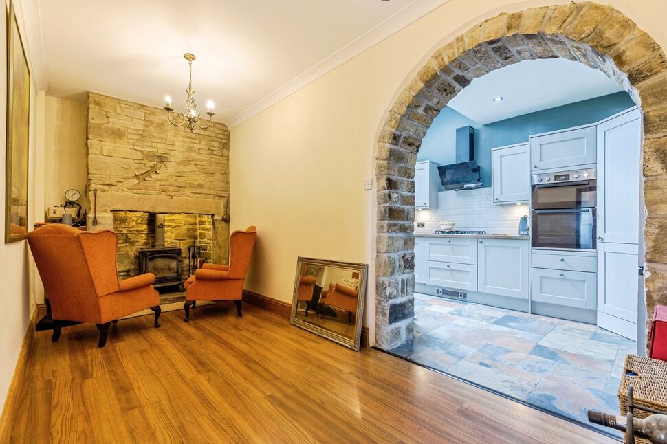 A separate area from the kitchen however half open via a stone arch doorway. The room again has a feature fireplace with inset fire and stone hearth. Steps to the lower cellar level.