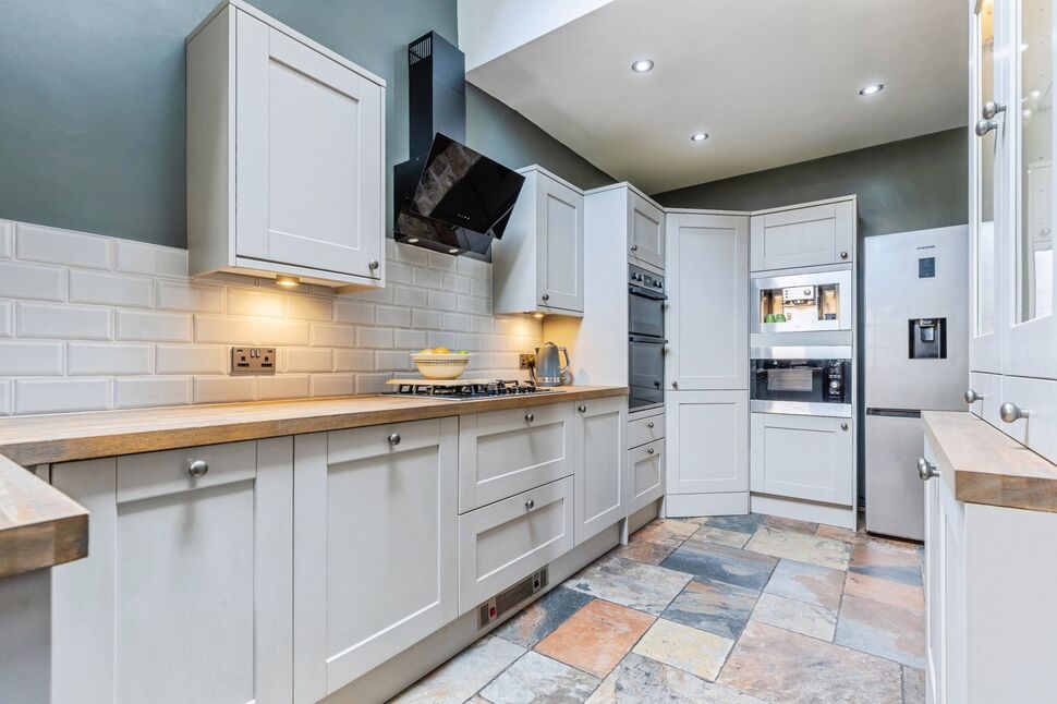 A lovely modern kitchen with high ceilings, velux windows and rear aspect windows and door to side. The kitchen has ample worktop space and plenty of under and over counter units for storage, not forgetting the large pan drawers too. There is an integrated gas hob, double oven, dishwasher, fridge freezer, microwave and coffee machine.Tiled splashback areas, larder unit and exposed stone walls.