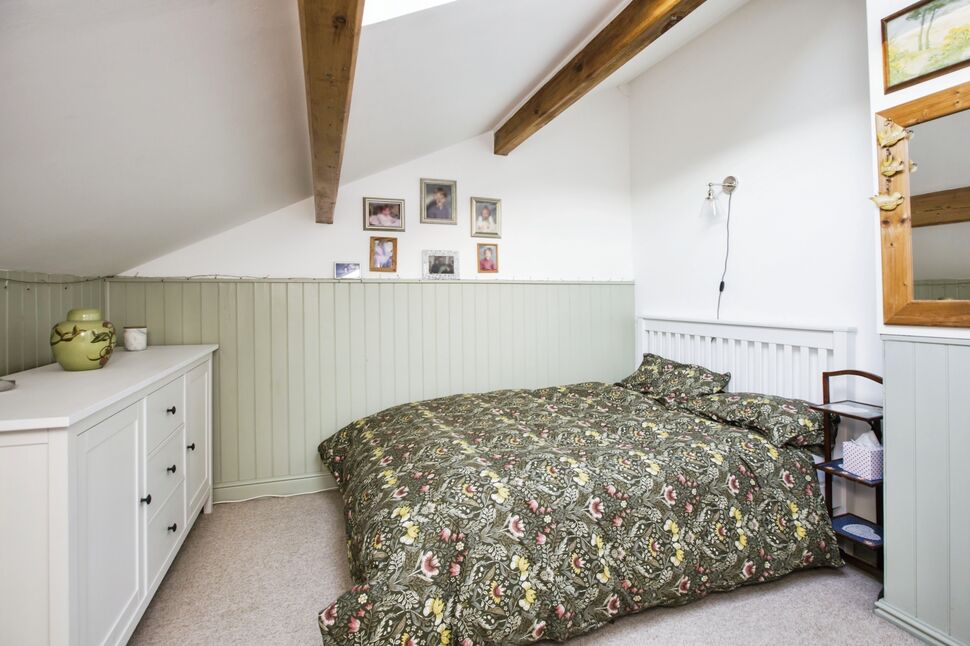 A lovely light and airy spacious bedroom with velux windows comfortably fitting a double bed. Under eave storage.