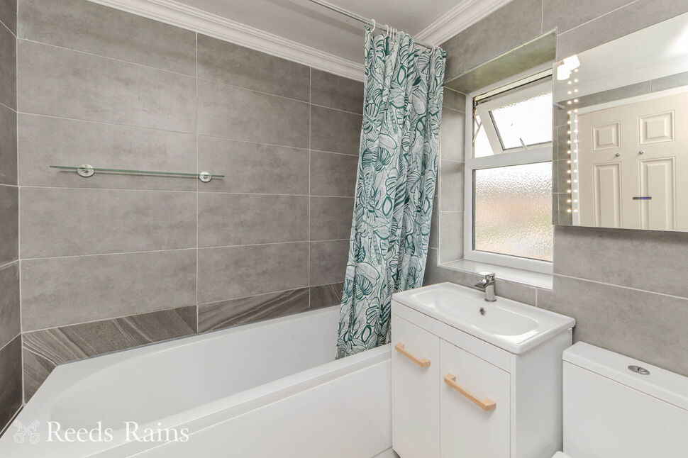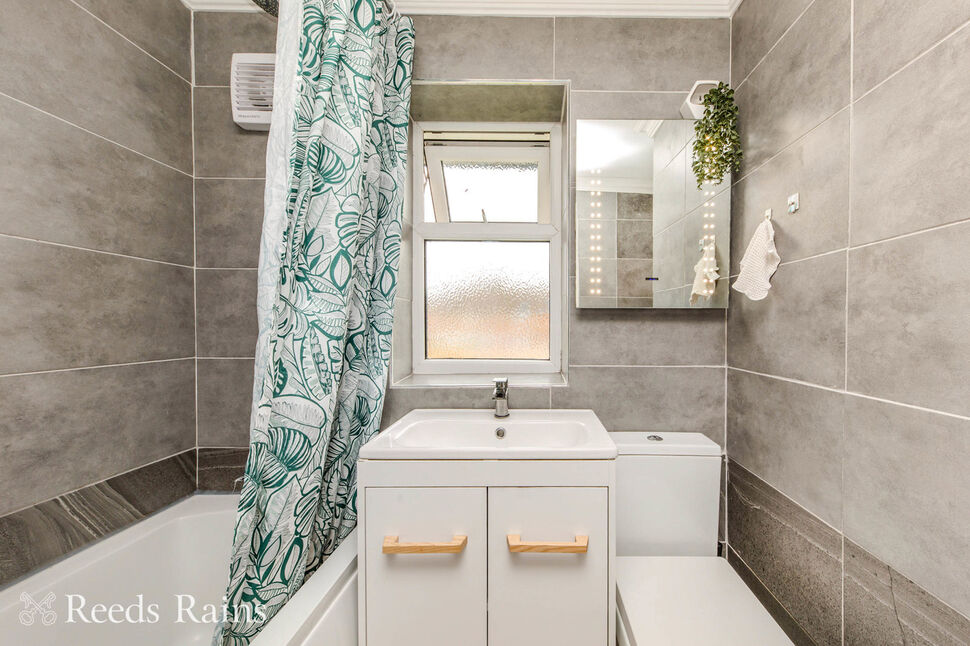 PVCu frosted glazed window.Three piece white suite comprising of a close coupled WC, vanity basin and a panel bath.Coving. Fully tiled walls. Heated towel rail.