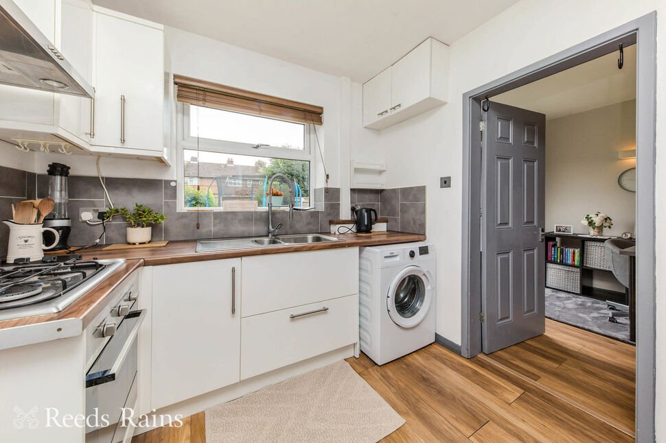 PVCu double glazed window.Modern range of gloss white wall, drawer and base units with walnut style work surfaces that incorporate a one and a half bowl stainless steel sink with mixer tap.Integrated electric oven, four ring gas hob and a stainless steel extractor hood.Space for a fridge freezer. Further space and plumbing for a washing machine.Under stairs storage.Radiator. Laminate wood flooring.