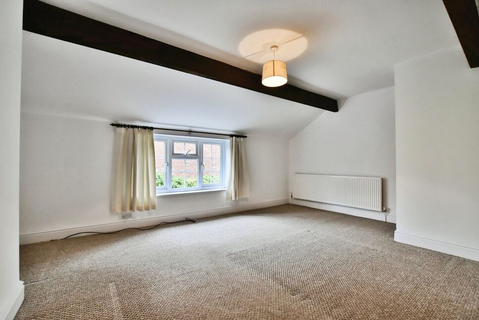 A large double room with a feature of original exposed timber beams, carpeted flooring, large window to the front of the house and radiator.