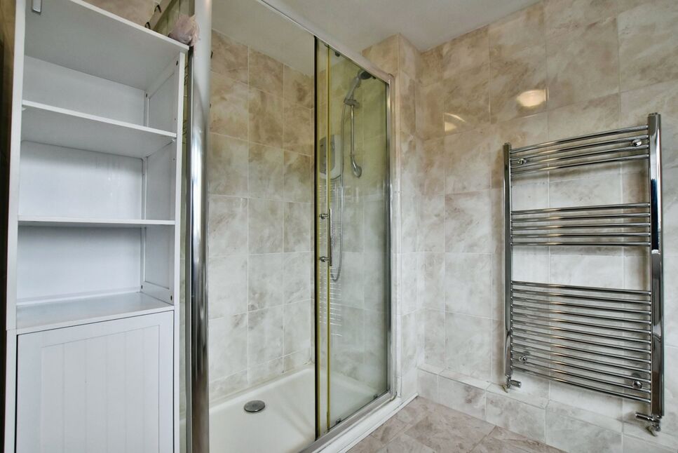 Fitted bathroom, fully tiled with toilet and sink, walk-in double size shower with electric shower and glass screen, window to the rear, and towel rail. Tiled walls and flooring.