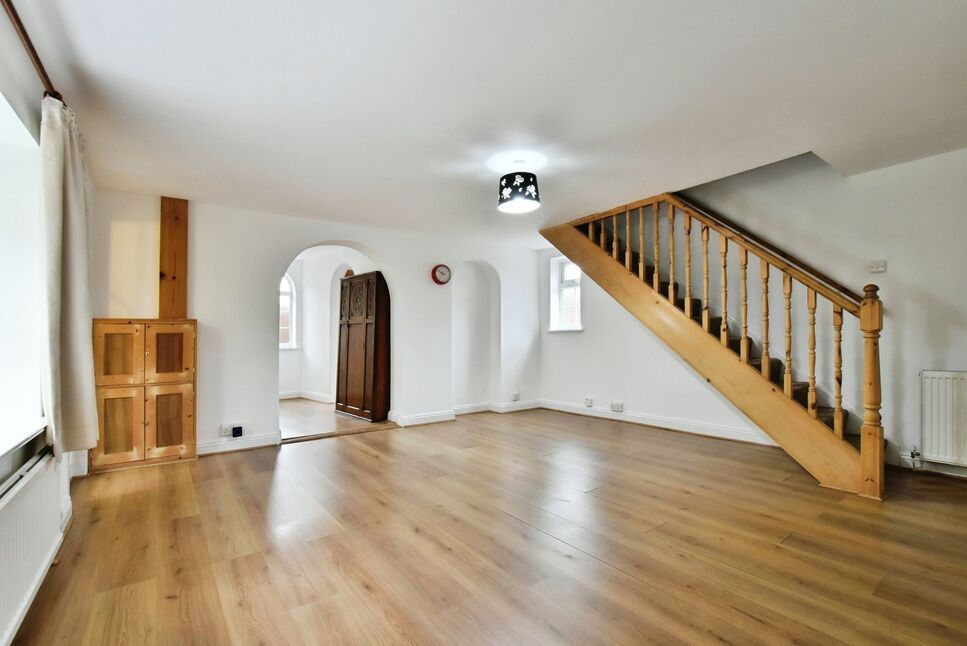 A bay window to the front elevation and a smaller window to the rear, laminate flooring electric 'plasma' style fire, large radiator, and a stripped pine spindle stairway to the upper floor. Access through an archway to dining and kitchen.