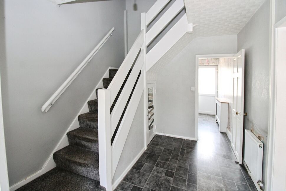 Stairs to first floor, understairs storage cupboard housing meters, radiator.
