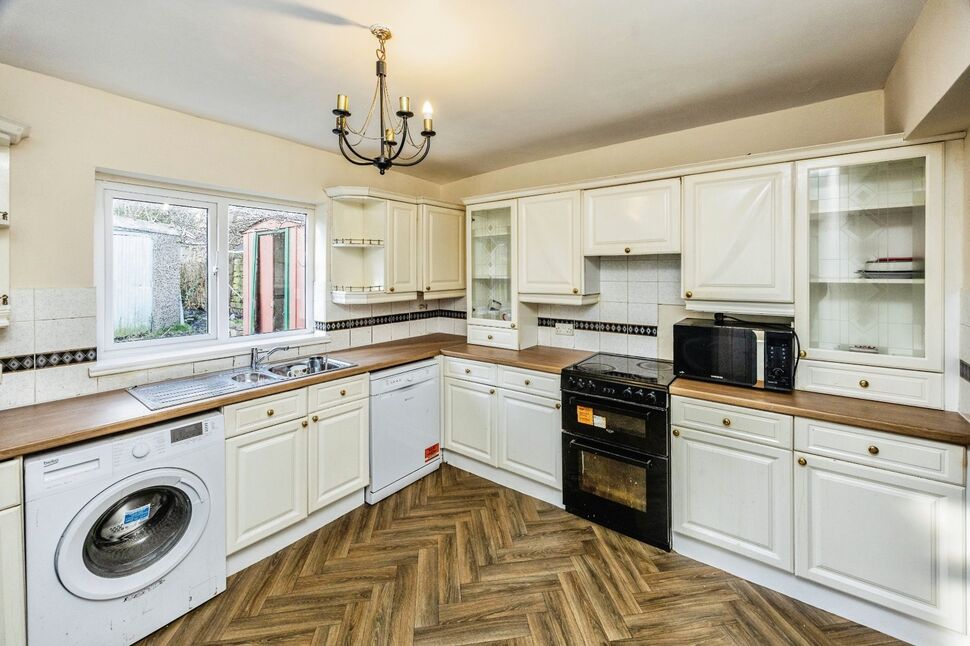 Fitted with a selection of modern base and wall units with a working area incorporating a stainless steel sink and drainer with mixer taps above. Including an electric cooker point with extractor over, plumbing for an automatic washing machine and dish-washer.