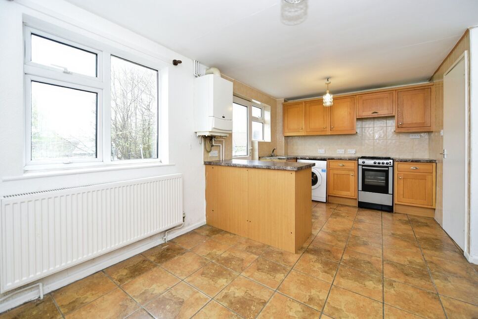 A large kitchen, with plenty of space for a dining table. Laid with stylish brown tiling. Plenty of cupboard space allows for ample storage. White UPVC door leads to the rear garden.