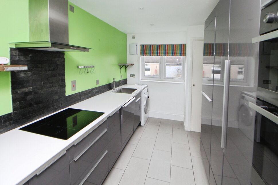 A modern fitted kitchen with a range of grey gloss units including integral fridge/freezer and dishwasher, work surfaces, stainless steel sink unit, built in electric oven and grill, four ring electric hob with extractor over, tiled splash back and built in cupboard.