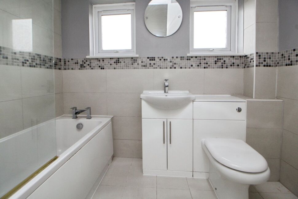 Fitted with a modern white suite comprising; bath with shower over, combined vanity unit and concealed tank WC. Recessed ceiling lighting, extractor fan and chrome towel radiator.