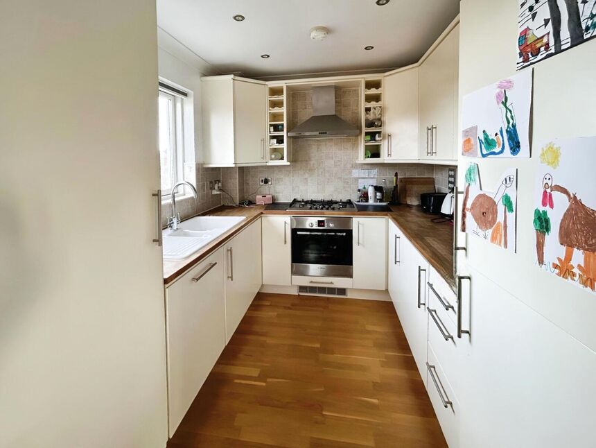 Laminate flooring, range of matching wall and base units with built in Bosch oven with inset gas hob over and Bosch extractor fan over, built in fridge freezer, built in dishwasher, one and a quarter stainless steel sink with side drainer, double glazed window to rear.