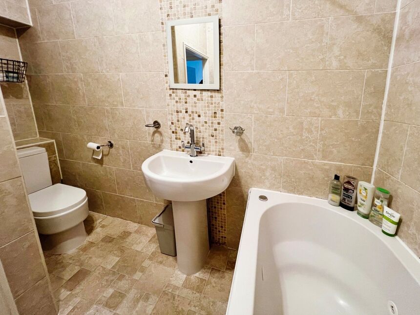 A stylish white three piece bathroom including Jacuzzi bath with shower over, low flush WC and a wash hand basin. Finished with neutral tiling and central heating radiator.