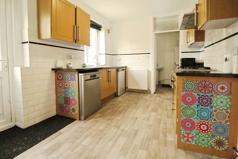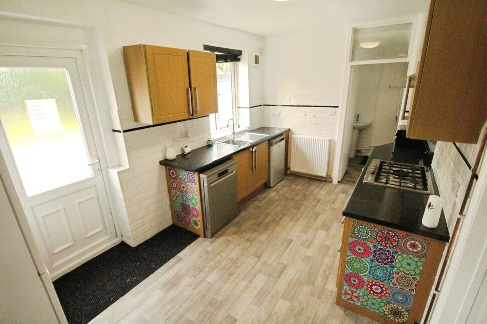 Rear facing double glazed UPVC door giving access to the rear garden and rear facing double glazed window, radiator, neutral décor, fitted kitchen with a good selection of wall and base units, sink & drainer, Oven, gas hob and extractor, free standing fridge/freezer and washing machine, dining area.