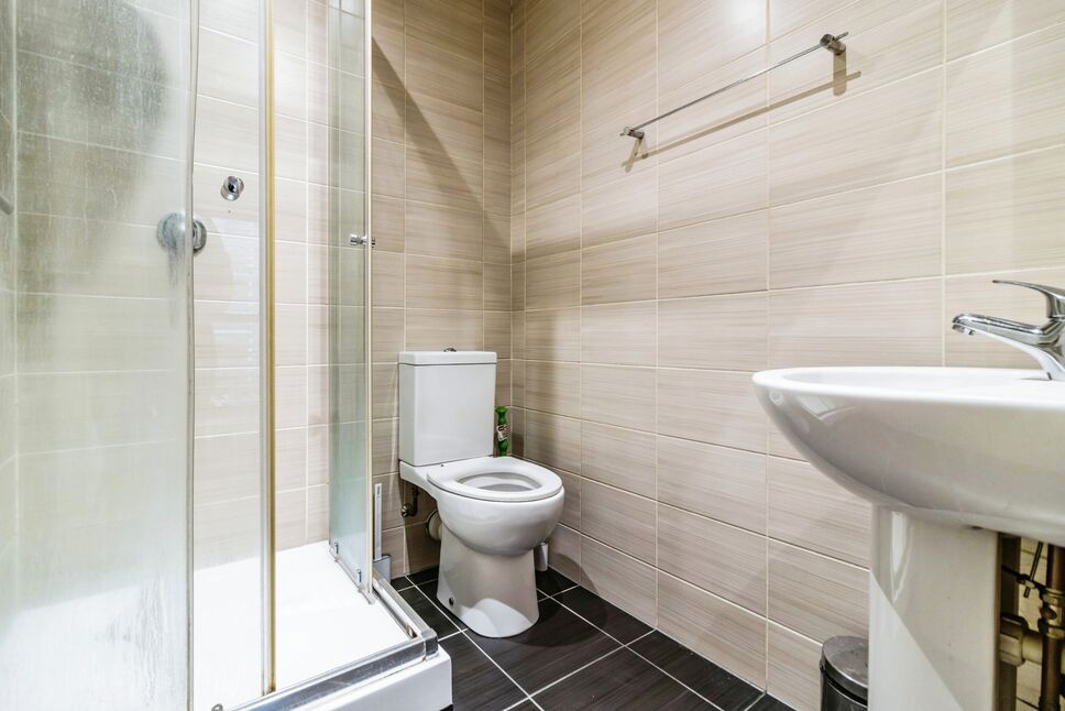 Shower cubicle, wash basin with mixer tap, WC, tiled walls and floor.