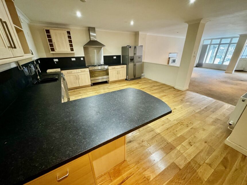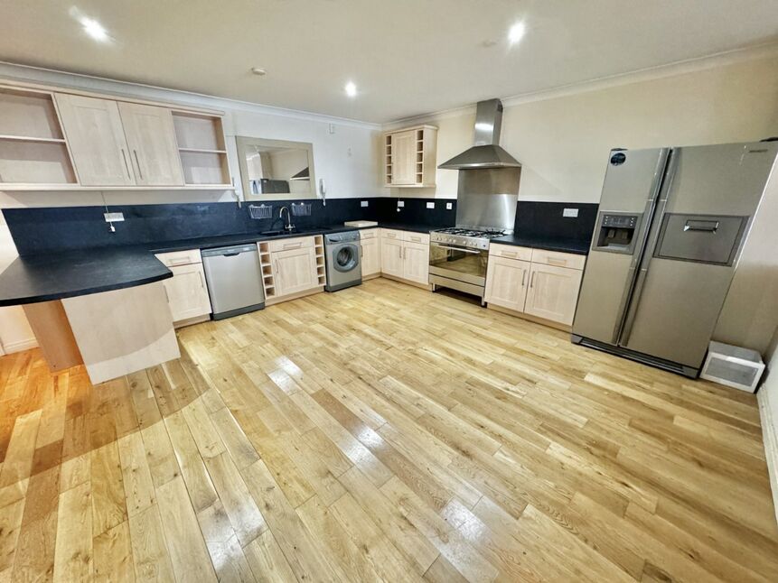 A spacious kitchen offering a comprehensive range of wood effect wall and base units with contrasting work top surface rears with splash backs and incorporating an inset sink unit. Gas range cooker with an extractor over. Washing machine, dishwasher and a American style fridge / freezer. Oak flooring and a radiator. Door leading to the bathroom / shower room. Opening though to the living area.
