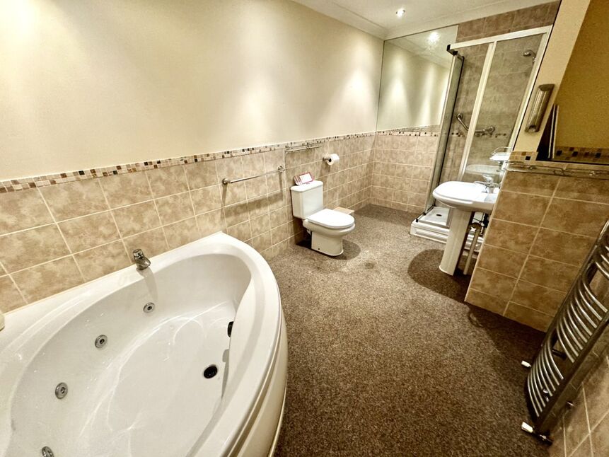 A white four piece suite which includes: corner spa style bath, step in shower cubicle, pedestal wash basin basin and a low level WC. Part tiled walls and a ladder style towel radiator.