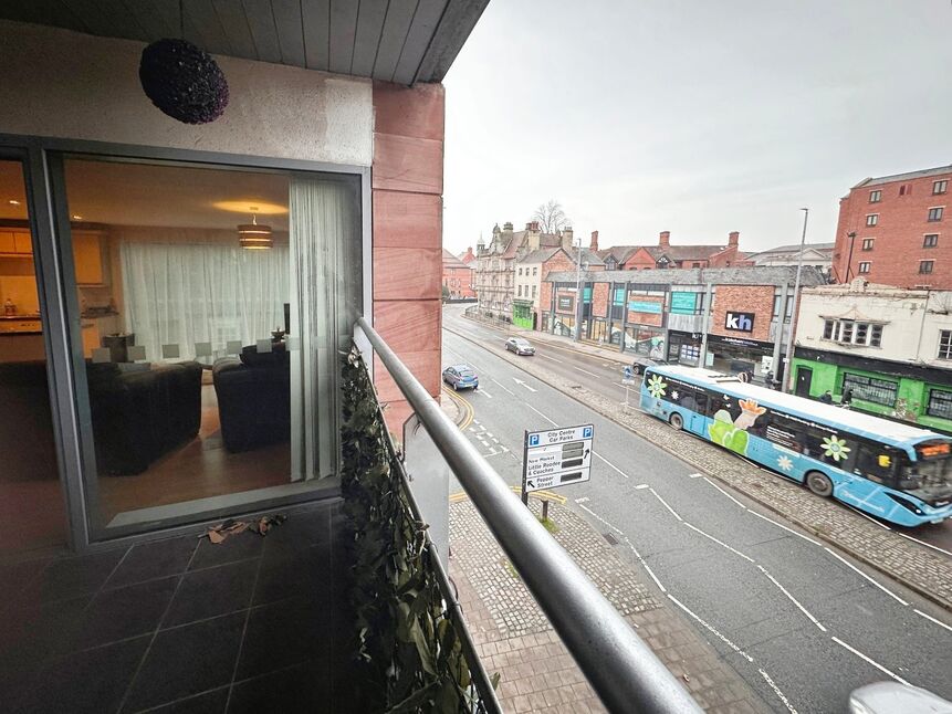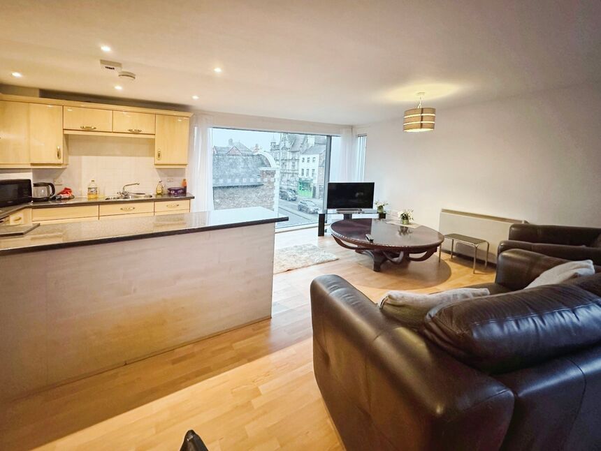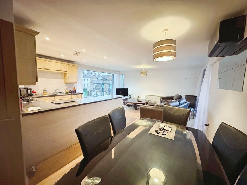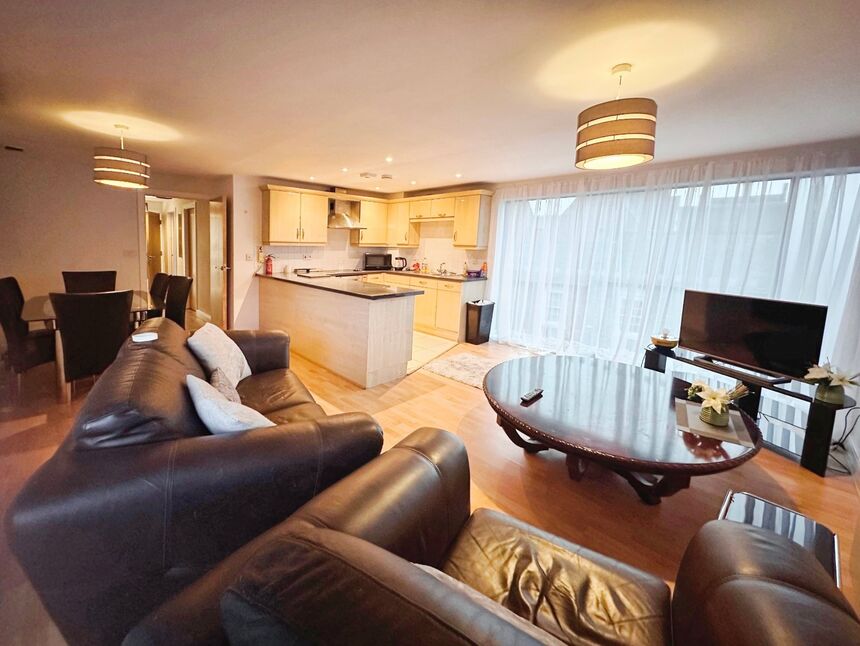 Lovely open plan living space with laminate wood flooring, double panel radiators, air conditioning unit for hot & cold air, breakfast bar, fully fitted kitchen, huge window that allows natural light to fill the room and also has the window that leads onto the balcony.