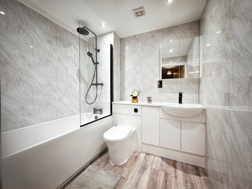 Fully tiled bathroom with built in cupboards, all finished to a high standard