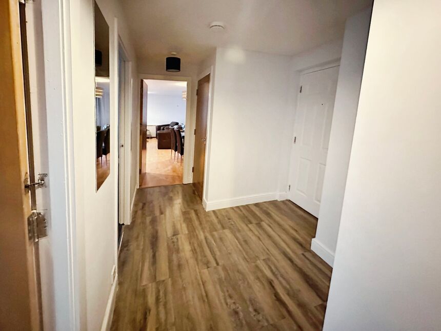A spacious entrance hall with laminate wood flooring, 2 separate cupboards for storage.