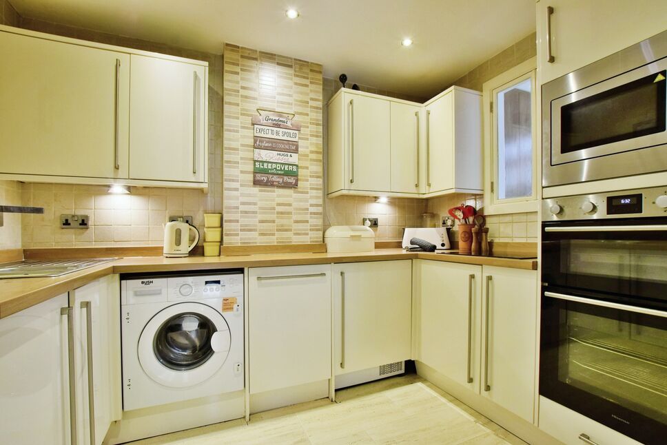 A lovely kitchen fitted with a range of cream units, tiled splash backs and contrasting work surfaces. Built-in high level double oven with an integrated microwave above. Space for a washing machine, dishwasher. Hob with extractor. Downlighters, window.