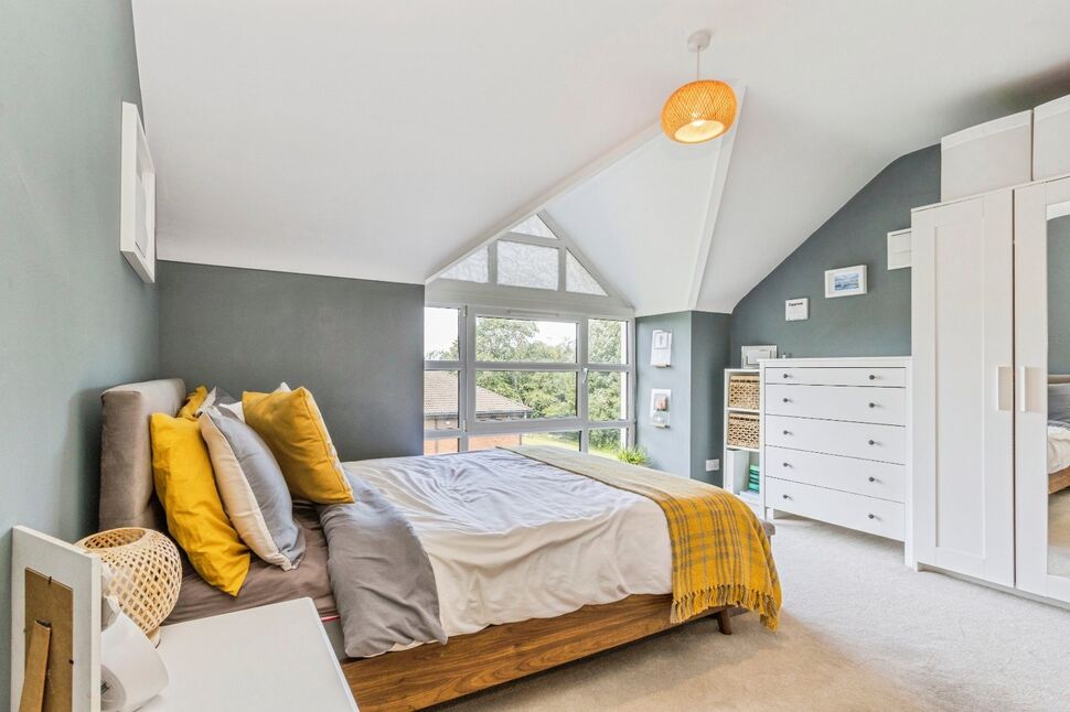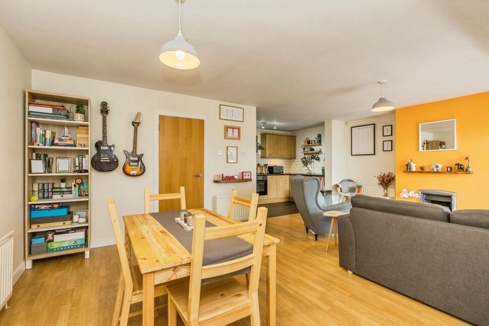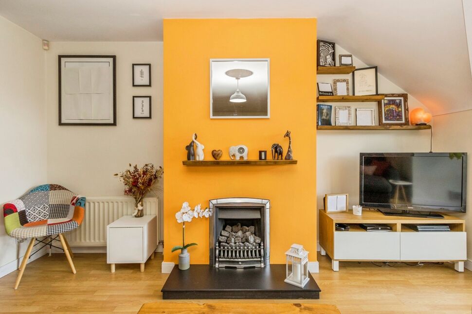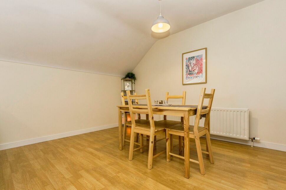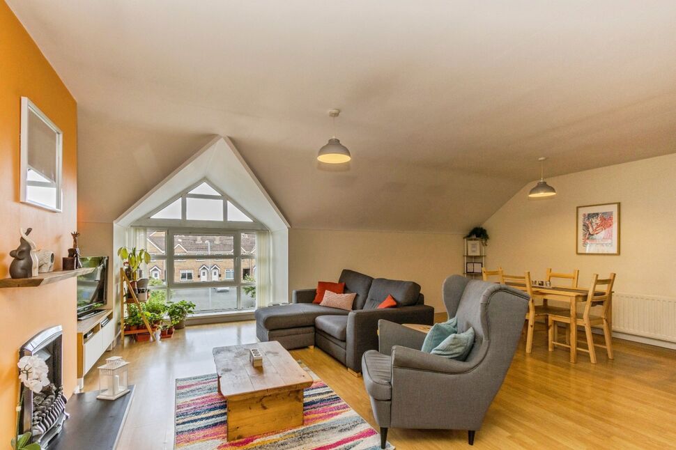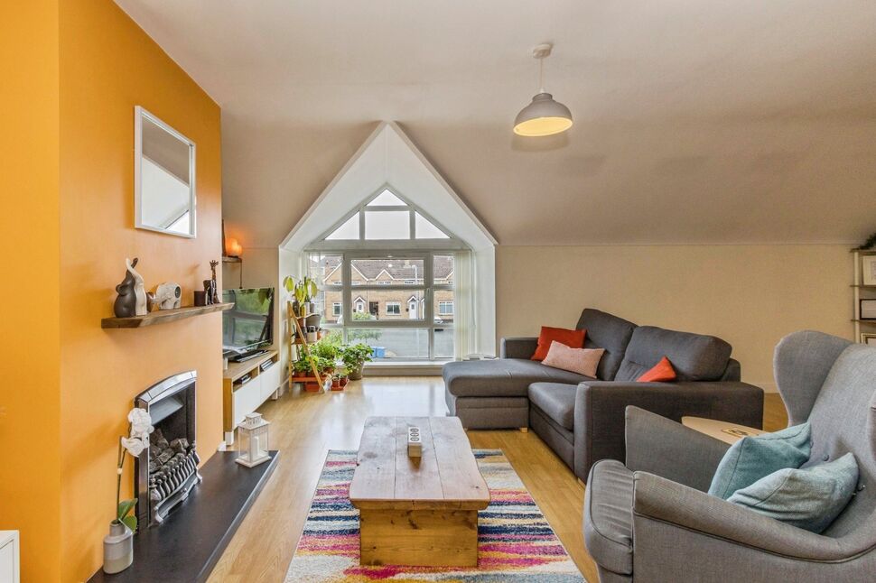 Laminate wooden floor, vaulted ceiling, floor to ceiling square bay window, hole in wall fireplace piped for gas fire. Open plan to kitchen.