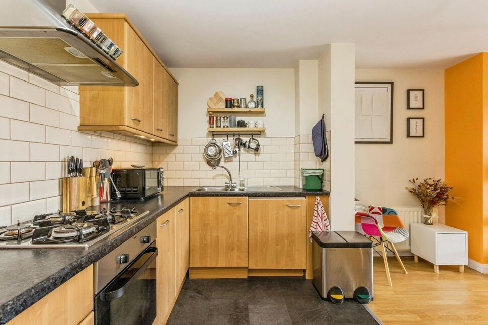 Single drainer 1.5 stainless steel sink unit with mixer taps, excellent range of high and low level units with laminated work surfaces, built in oven and 4 ring gas hob, stainless steel chimney extractor fan,integrated washer dryer, gas fired boiler, wine rack, laminate wooden floor, part tiled walls.