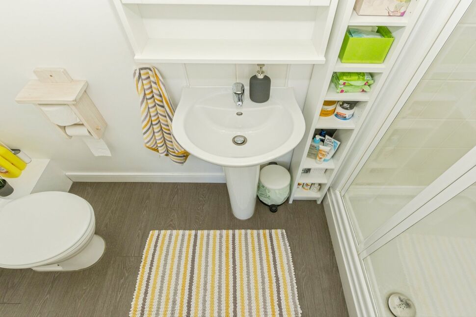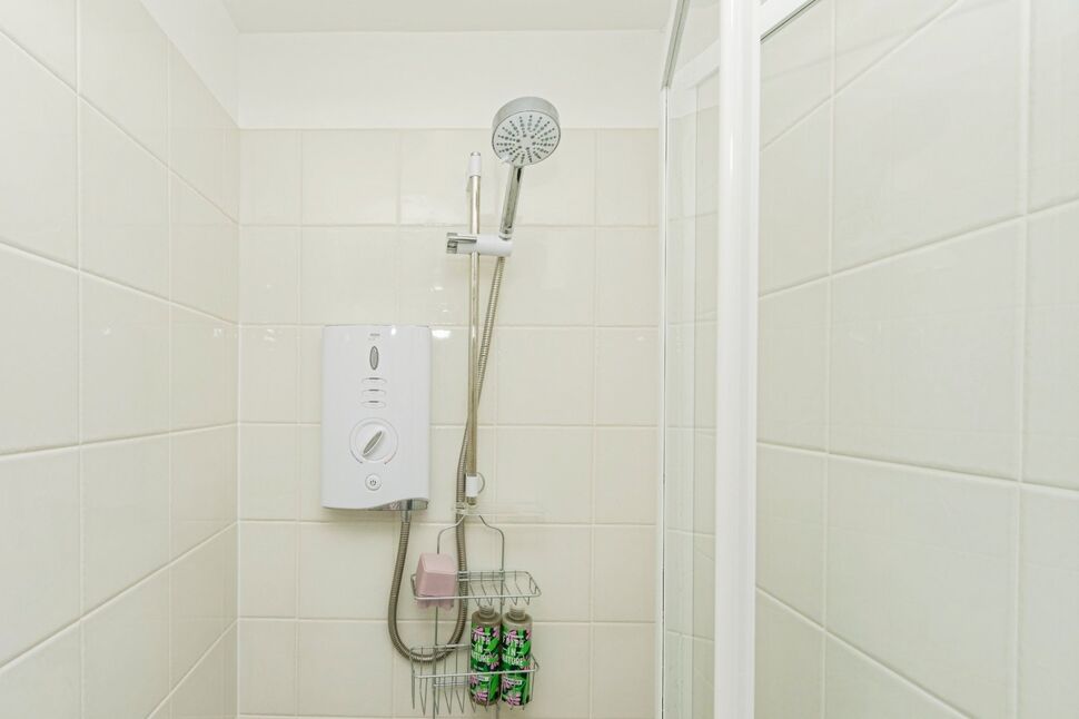 Luxury white suite comprising: Fully tiled built in shower cubicle with Mira shower unit, pedestal wash hand basin with tiled splash back, dual flush WC, laminate wooden floor, extractor fan.