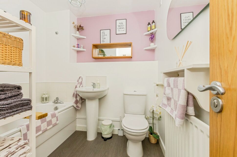White suite comprising: Panelled bath with mixer taps, pedestal wash hand basin, dual flush WC, extractor fan, part tiled walls, laminate wooden floor.