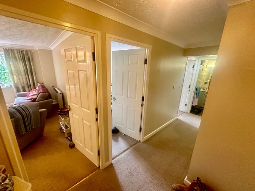 The apartment is found on the first floor, upon entry is a generous hallway with useful twin storage cupboards, there is a large living/ dining room with views over the gardens, separate fitted kitchen, two well sized double bedrooms, and a fitted bathroom.