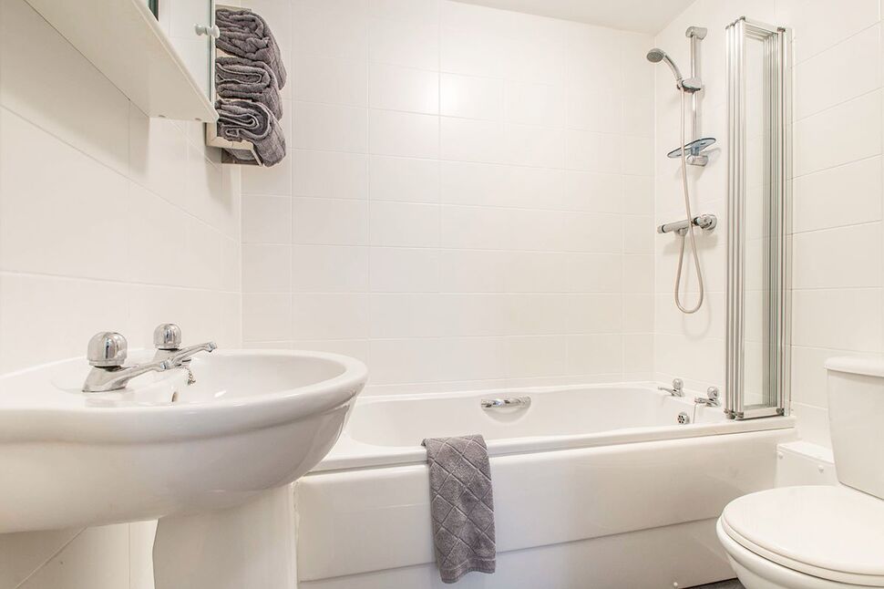 Modern white suite, incorporating rectangular panelled bath with thermostatically controlled shower over, and glazed folding shower screen, low level WC, pedestal wash basin, radiator, extractor fan, tiled walls.