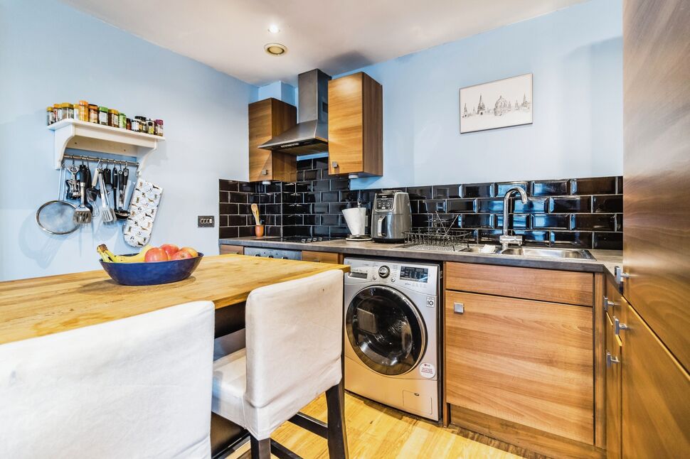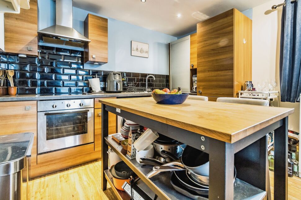 Dual aspect with glazed doors onto balcony and a further window for additional natural light. Wooden-style flooring to match the hall. The open-plan kitchen features a range of fitted base and wall units, integral electric oven and hob with extractor hood, 1.5 bowl sink with mixer tap, integral fridge/freezer, tiled splashbacks, recessed spotlights, recess with plumbing for a washing machine.