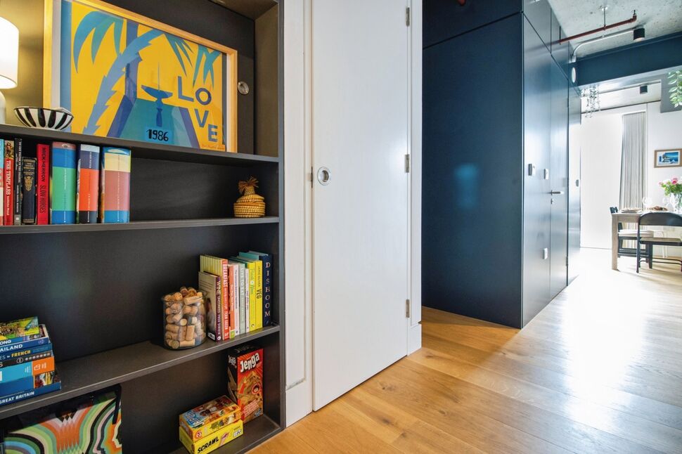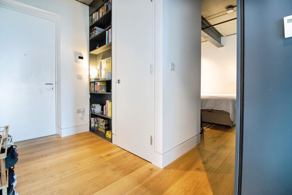 Open-plan hall with stylish engineered light oak flooring which continues into the living area and bedroom. Fitted book/display shelving and cupboard with water heater and a washer/dryer which is fitted and will remain. Leading through to: