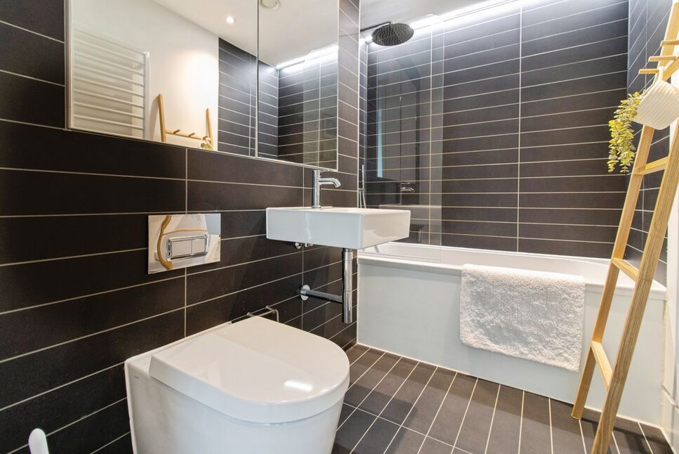 Luxuriously appointed featuring a panelled bath with twin-head shower, wash basin with mixer tap, WC, tiled splashbacks and flooring, heated towel rail.