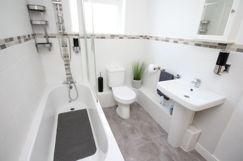 White suite comprising panelled bath with wall mounted rain head shower and shower attachment. Pedestal wash hand basin and low flush wc. Part tiled walls and tiled floor.